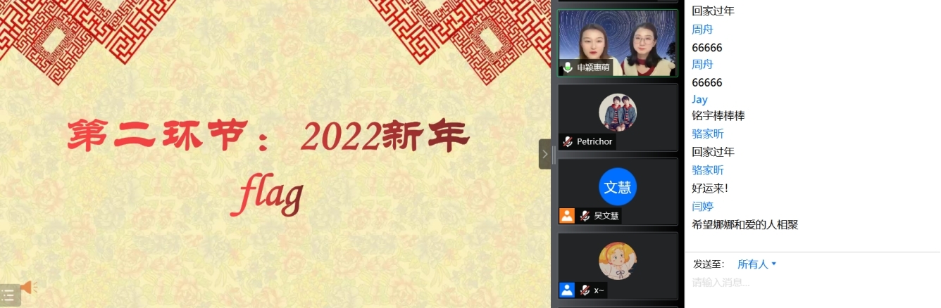 表演环节结束后,晚会进入了第二环节——2022新年flag,在场的同学们纷纷为自己立下新年目标,带着去年的遗憾与新年的期望,带着对自己的祝愿与激励,踏上了奔赴更好人生的新年旅途。