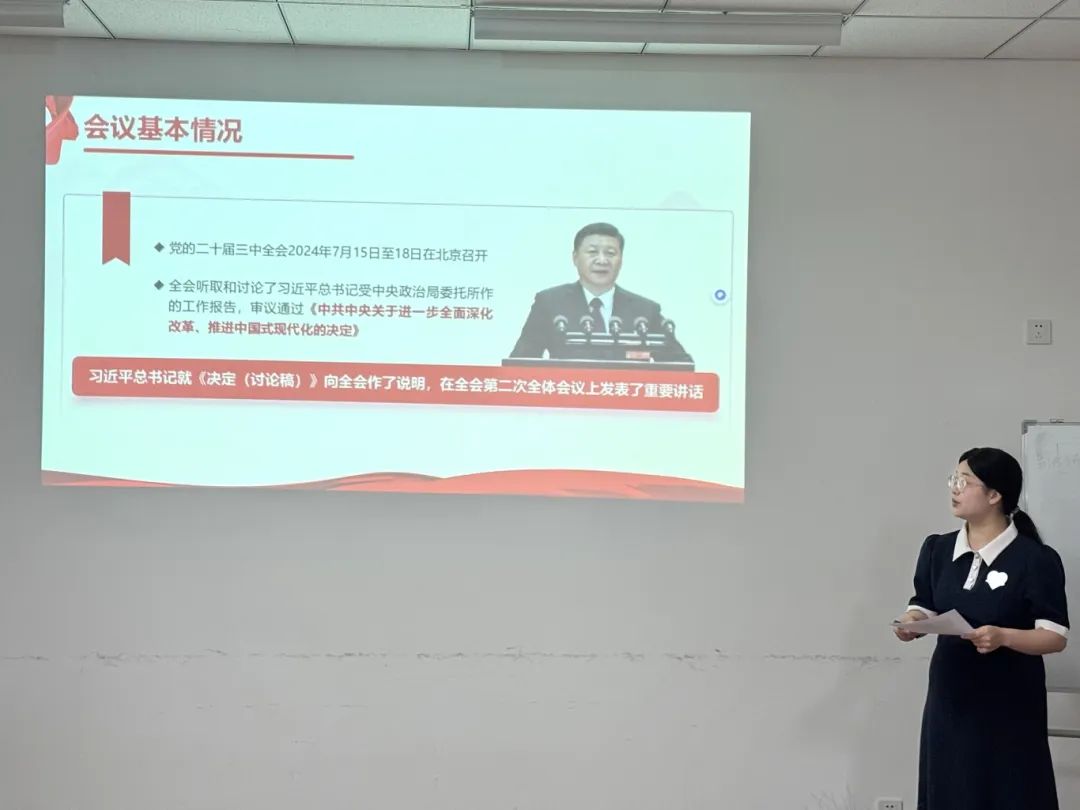 随后,新葡萄官网红桅杆思政理论学习社团成员熊丽娜以《学习贯彻二十届三中全会精神》为题,围绕全会召开的基本情况、习近平总书记在全会上的重要讲话精神、进一步全面深化改革举措的重要意义以及全会精神的贯彻落实等方面进行宣讲。通过生动的案例阐述,引导青年团员们深刻认识进一步全面深化改革、推进中国式现代化的重要性。