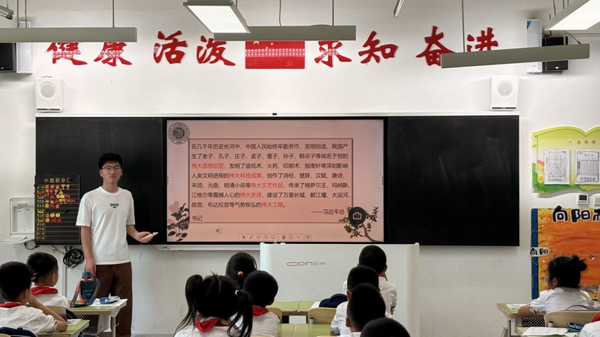马万博以《我自豪 我是中国人》为题,回溯了五千年中华文明的璀璨星河,向同学们展现了甲骨文的神秘、四大发明的智慧以及新中国成立后的辉煌成就。