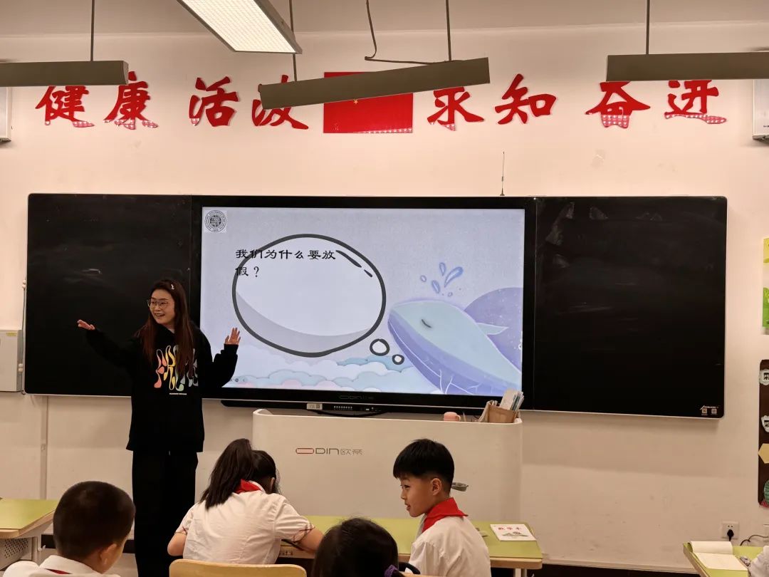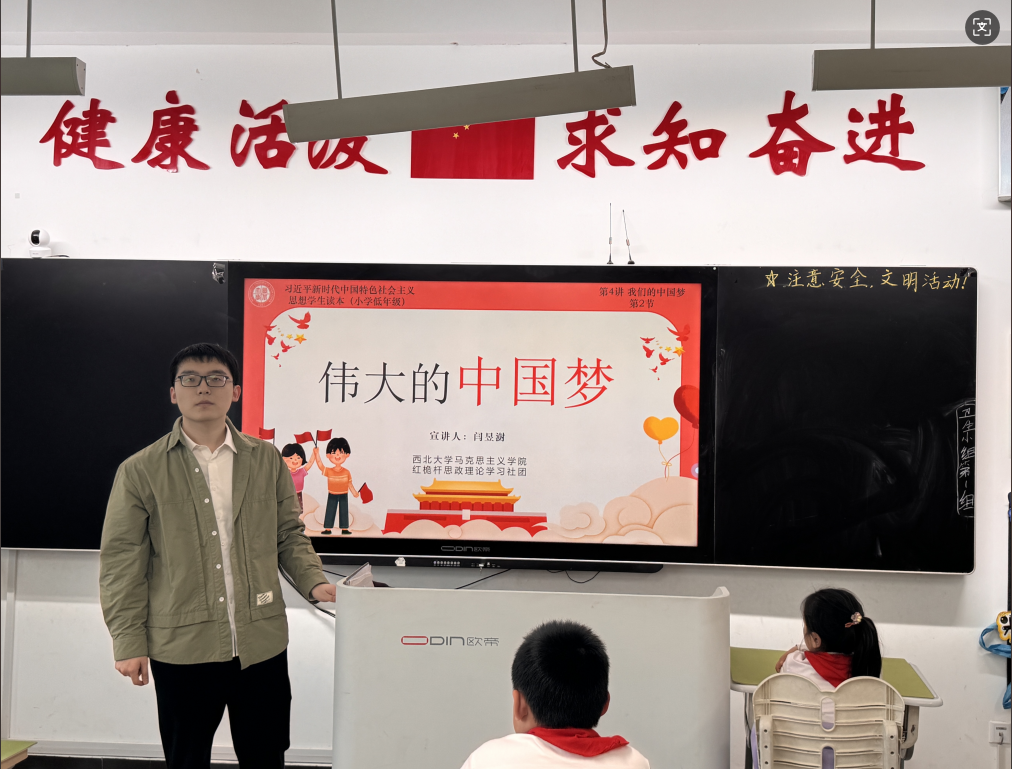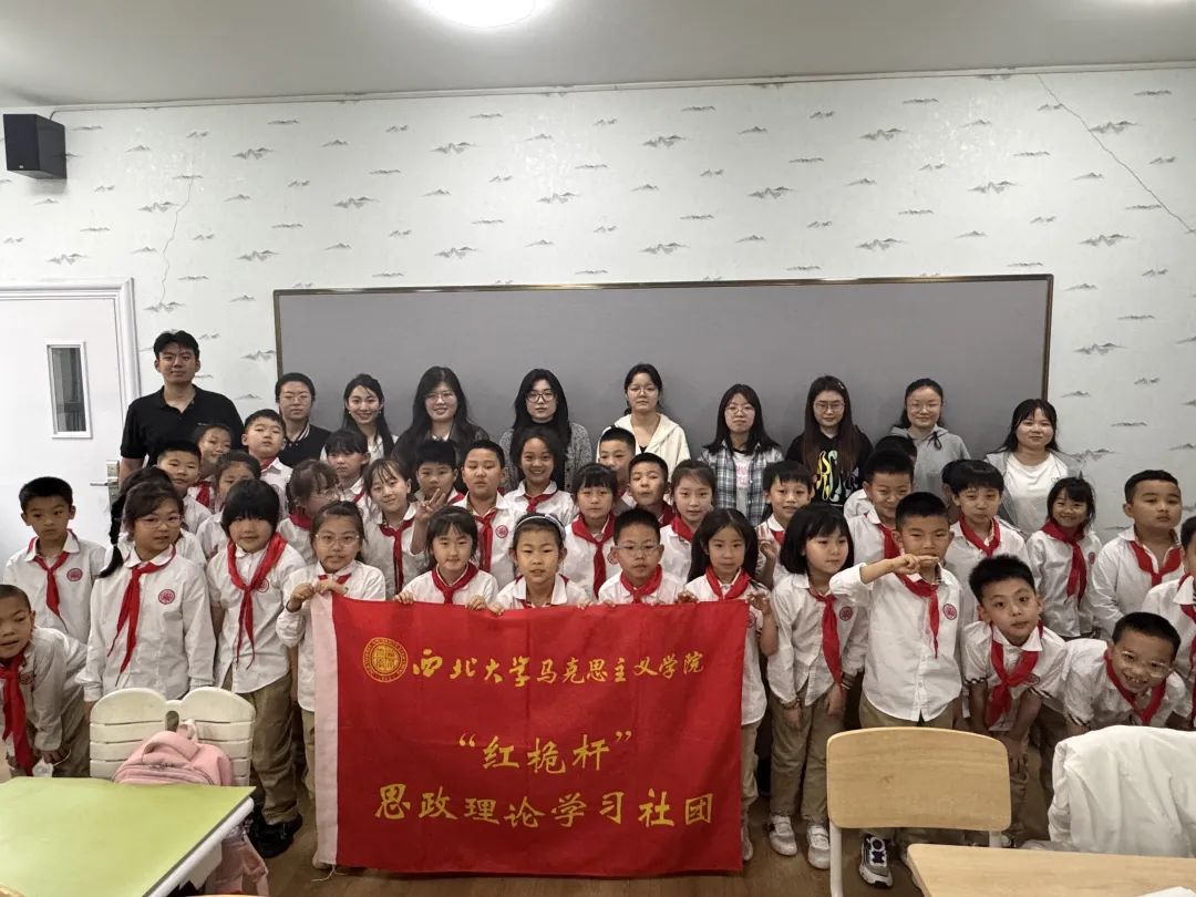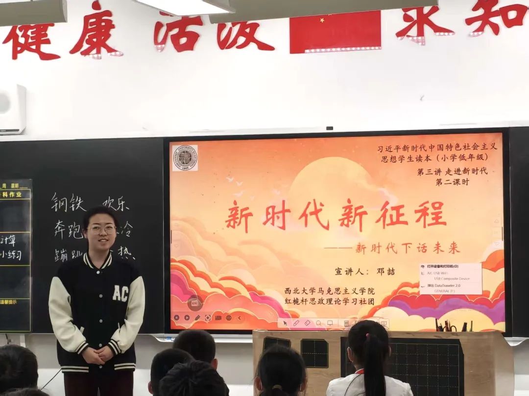 4月21日,新葡萄官网红桅杆思政理论学习社团在西安市长安区第一小学实验小学,以《习近平新时代中国特色社会主义思想学生读本》(小学低年级)为主要内容,为二年级的小学生讲授思政课。主讲人分别是来自2023级和2024级的马克思主义基本原理、思想政治教育、马克思主义中国化研究与中国近现代史基本问题研究专业的13位硕士研究生。