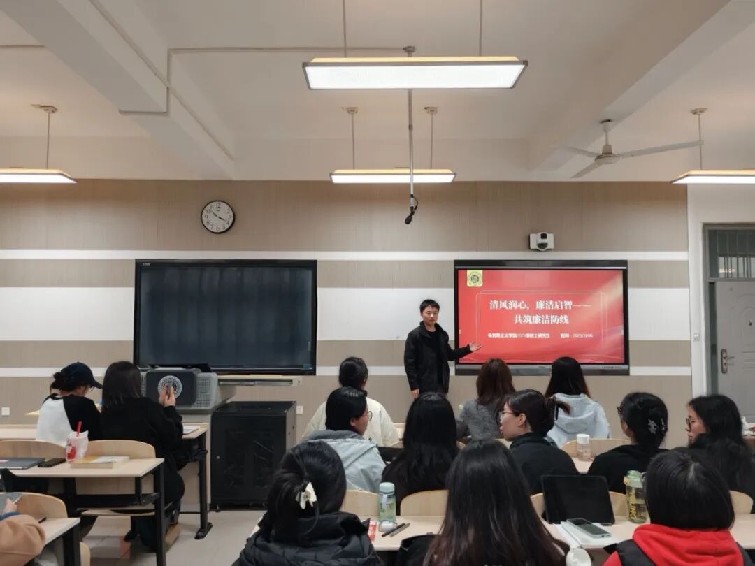 活动伊始,万超结合《习近平关于党风廉政建设和反腐败斗争论述摘编》相关内容,带领大家深入学习了国家法律法规、廉洁自律准则以及校规校纪的核心要义。他谈到,作为新时代马克思主义理论专业的研究生,不仅要在学术上求真务实,更要在思想上筑牢廉洁防线。廉洁不仅是纪律要求,更是青年学子修身立德、成长成才的根基。同时,他呼吁大家要以“公诚勤朴”的校训精神为指引,将廉洁意识内化于心、外化于行,在日常学习与学生工作中守住底线、不越红线。