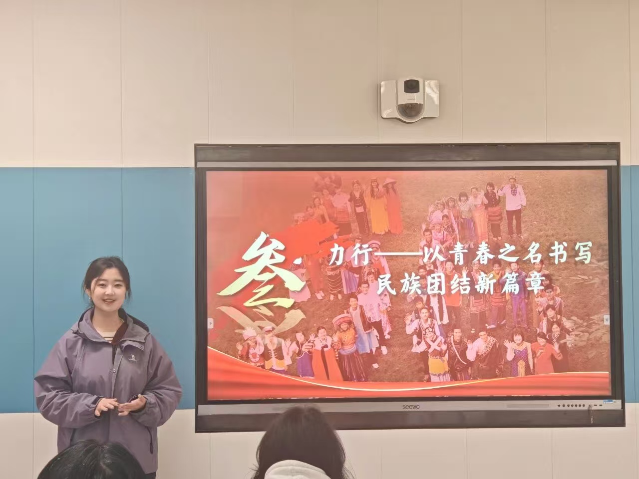 杨濡冰以《凝聚青春力量,争做新时代的“石榴籽”》为题,和同学们一起了解了中华民族共同体意识的时代内涵,并且从政策制度、经济发展和社会治理等领域向同学们呈现了我国在民族团结进步事业取得的重大成就。最后,她以王海洋两次进藏,建设边疆的故事为案例,呼吁同学们要坚定政治立场,增强文化认同,为推动中华民族共同体建设贡献力量。