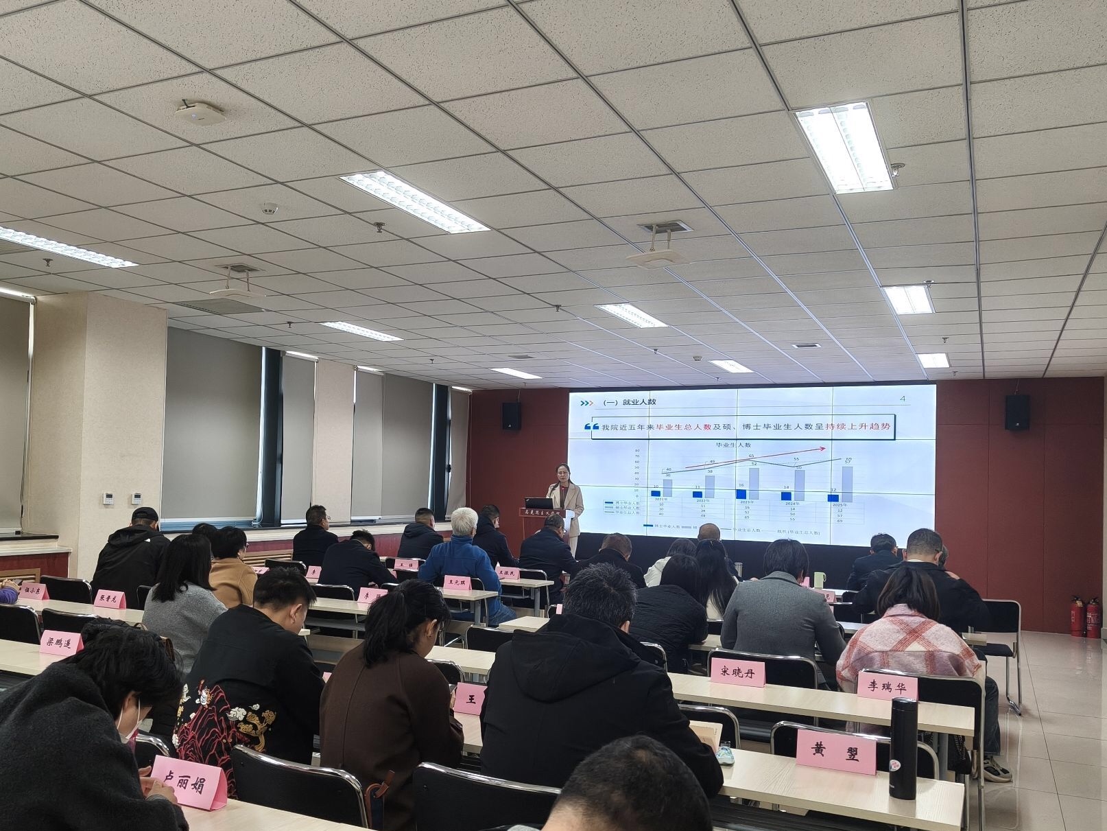 会议对2026届毕业生就业推进工作作了安排。院党委副书记邵平从毕业生生源情况、毕业生就业单位情况、毕业生就业地区情况等三个方面,对2021年—2025年毕业生就业状况作了详细分析。她表示,学院明确将强化访企拓岗与深化就业观念引导两大工作方向,健全全员促就业工作格局,助力2026届毕业生顺利就业。随后,她传达了省教育厅关于高校学生安全教育有关工作要求